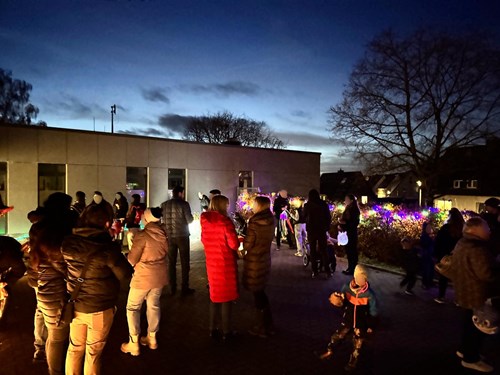 Im Anschluss machten sich alle Kinder mit ihren selbst gestalteten Laternen auf den Weg über den Schulhof. Die vielen leuchtenden Laternen verwandelten die Dunkelheit in ein farbenfrohes Lichtermeer.